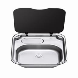 Evier en acier inoxydable rectangulaire avec couvercle en verre noir.